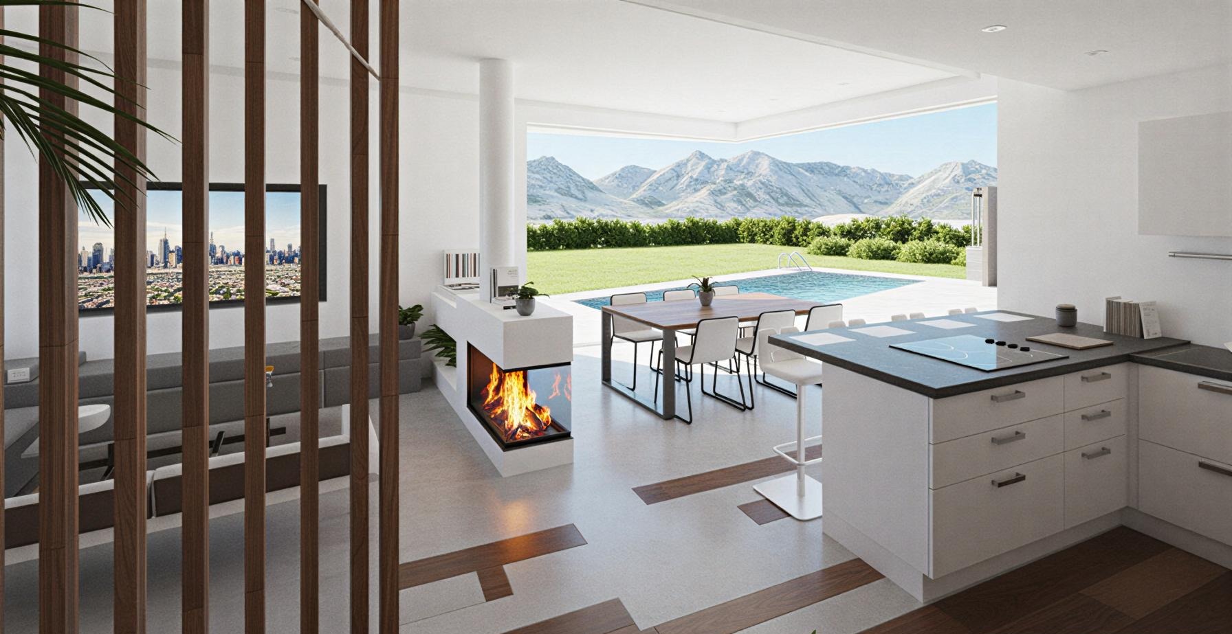 El comedor y la cocina miran al mar a través de una apertura en esquina limpia sin carpinterías gracias al sistema galandage.